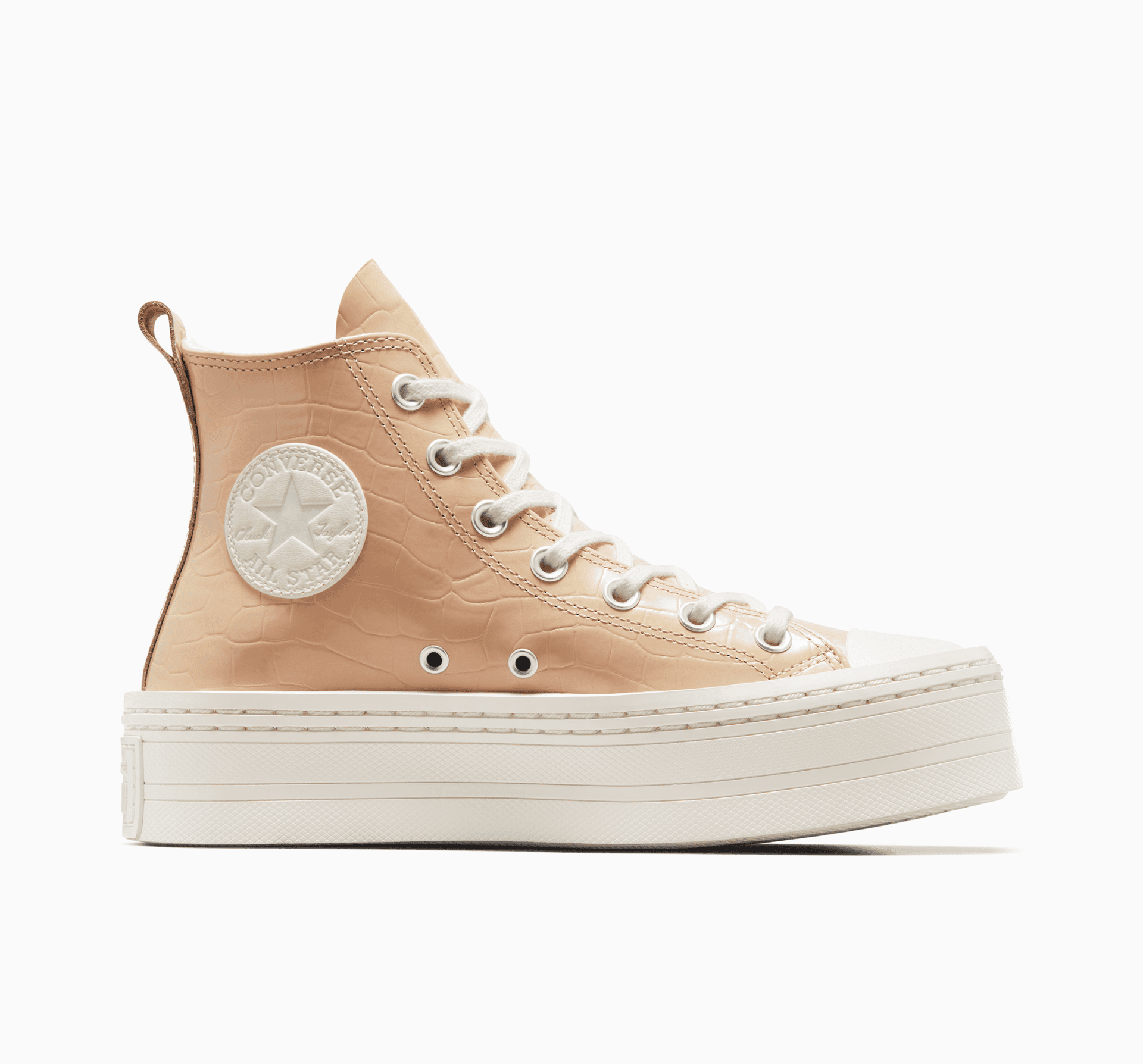 Тези платформи с висока горна част се разхождат по дивата страна с модел на крокодилска кожа и лъскава кожа за пълен блясък. Плюс това, неутралните цветове и тоналните детайли създават лесен за оформяне стил.
