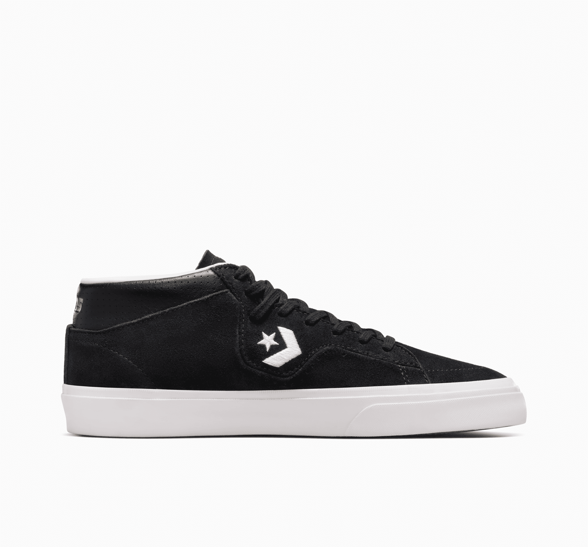Mid top rubber-backed suede skate shoe with leather collar.