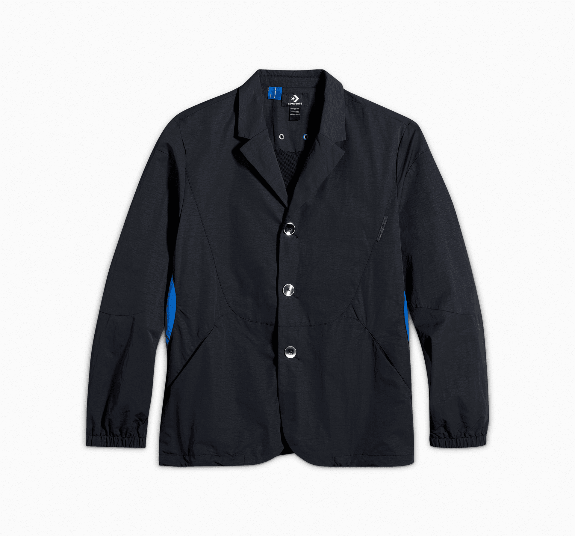 Новата колекция на Converse и ADERERROR включва блейзър, който съчетава функционалност с изискан стил. Акценти в характерното синьо на ADERERROR се вплитат в детайли като етикет от езика на обувка на яката, обърнати плисета и зигзагообразни шевове.