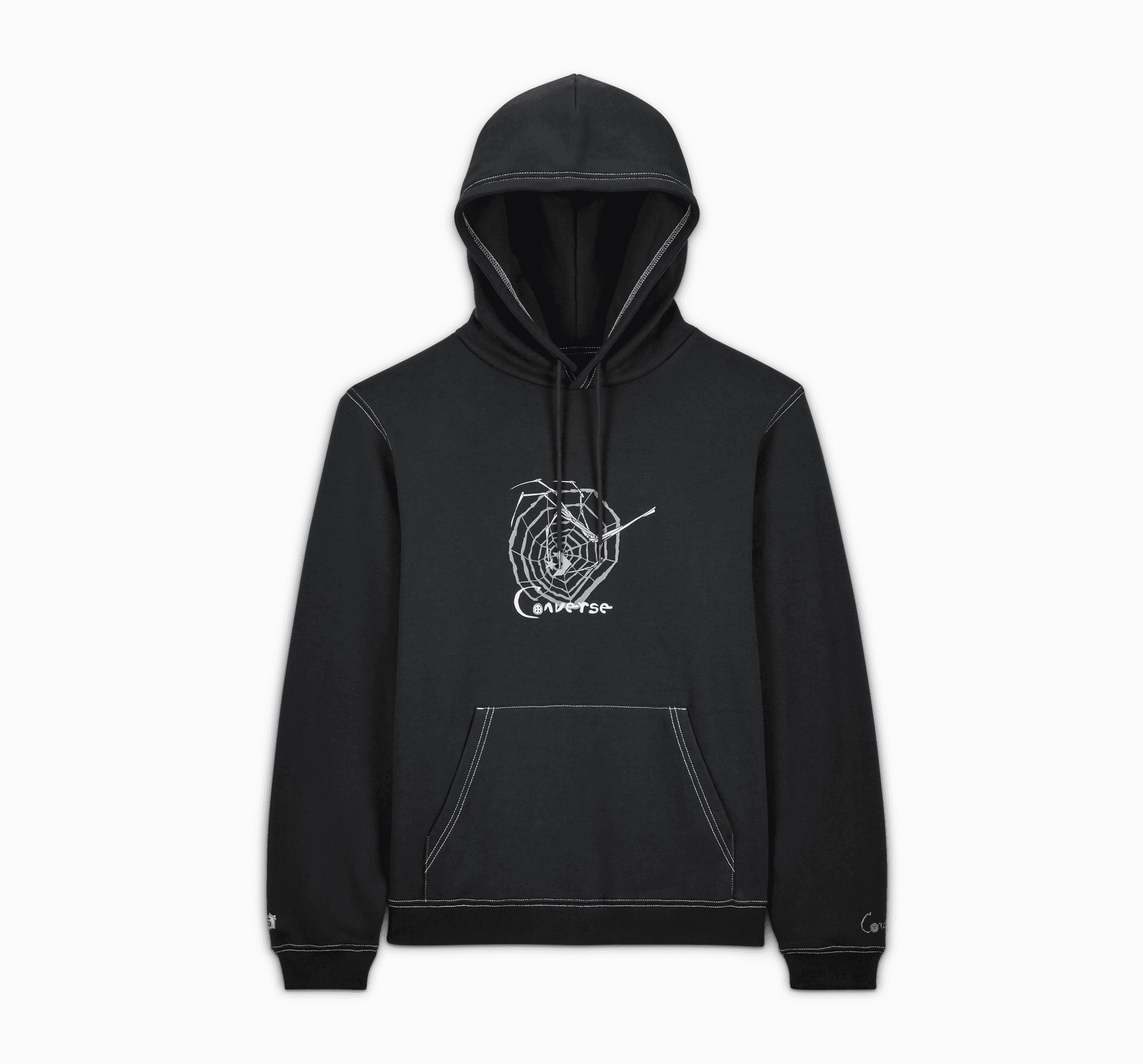 Converse celebrates 15 years of the beloved LAIKA film Coraline with a limited-edition collection, featuring this black hoodie with white contrast stitching. The design includes a 15th anniversary label, embroidered button holes, a haunting Beldam hand in rubber ink and a sleeve graphic.