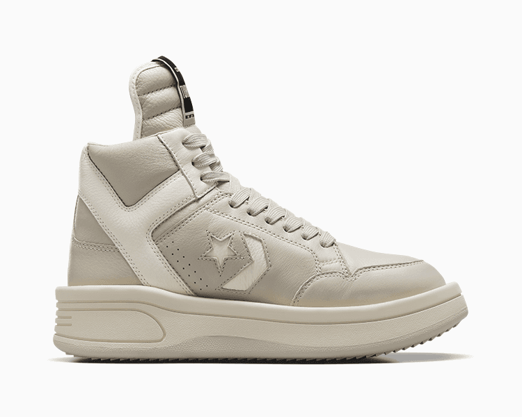 The punk-fueled collaboration with DRKSHDW transforms another court icon: the Converse Weapon. With a rebellious mindset to challenge the ubiquitous and break convention, Rick Owens exaggerates the proportions and distorts the lines of the legendary basketball sneaker. The result is a distinct design that sits at the intersection of hoops style and subversive fashion, bringing the edge of DRKSHDW boots to an iconic ‘80s basketball mid-top.